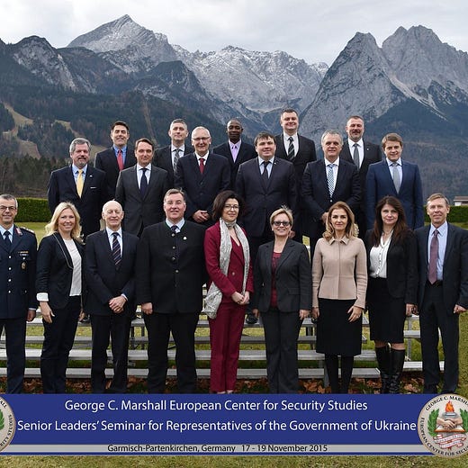 Less than a month after the election, Andriy Levus spoke at an “Oversight of the Security and Defense Sector” seminar organized by the George C. Marshall European Center for Security Studies (GCM ECSS), and hosted by the NATO Professional Development Program in Kyiv. The GCM ECSS is run by the U.S. Department of Defense and the German Ministry of Defense. A few years back, Levus participated in the GCM ECSS’ third annual Ukrainian Senior Leaders Seminar. So did Serhiy Vysotsky, a member of Free People, and Ivanna Klympush-Tsintsadze, who co-founded Odnodumci.